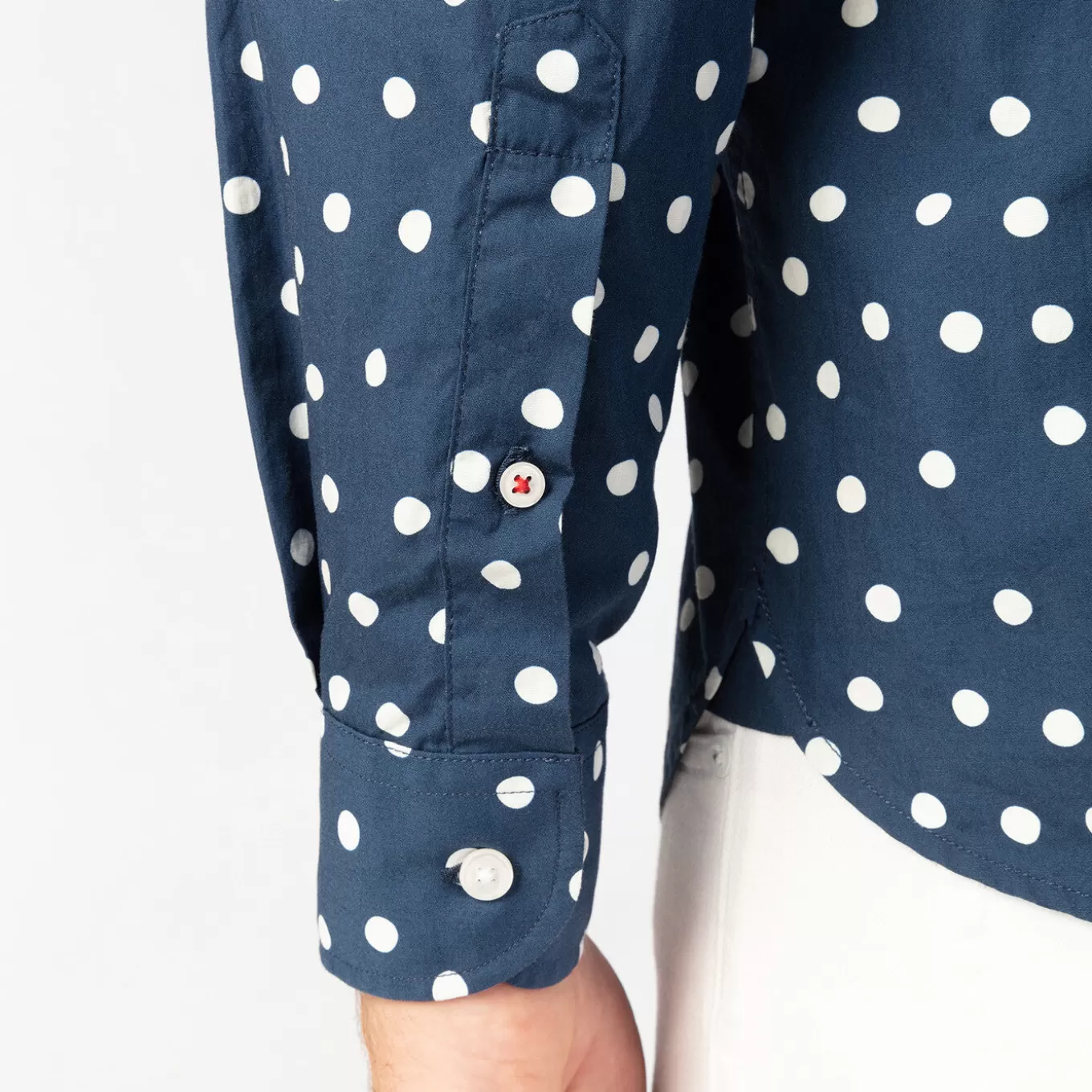 This dark blue long-sleeved shirt with white polka dots is made from French fabric. It consists of a rounded bottom, a …