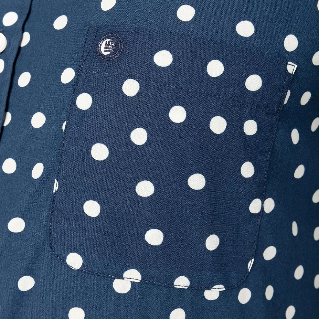 This dark blue long-sleeved shirt with white polka dots is made from French fabric. It consists of a rounded bottom, a collar with removable stays and white buttons. It also has a pocket on the chest as well as the tone-on-tone embroidered logo.